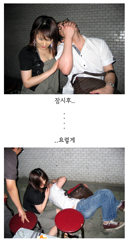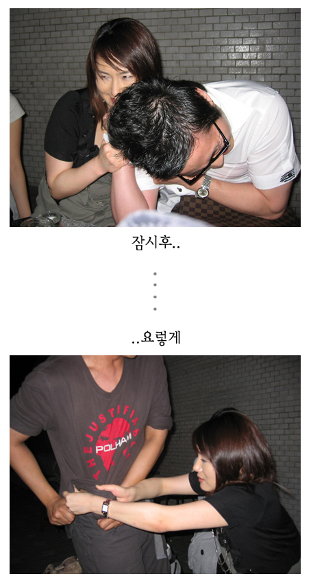 당해꾼 또당햇어... 저건 당하고도 웃을 수 밖에 없어... 머라할 수도 없고,...말리지도몬해... 옆에선 구경낫다고 웃으면서 구경만함... 나도 그기분 알어....아 마구마구 상상된다.,... 저쑤바의 표정을보라...은근히 웃으믄서... 한마디하지요...(표정 변하지도 않음. 항시유지.) 이루와봐~~~~~~