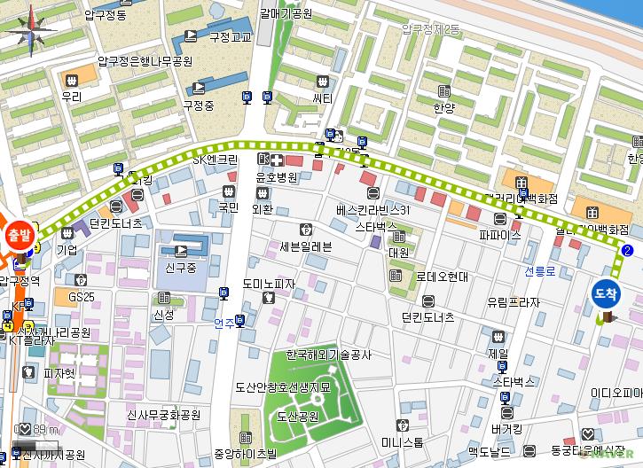 교통편은 지하철 삼호선 압구정역 2번출구로 나와서 현대아파트(백화점 말구.. 꼭 현대백화점에서 헤매는 사람들 있슴) 앞에서 버스 암꺼나 타시구 겔러리아 백화점에 내리셔서