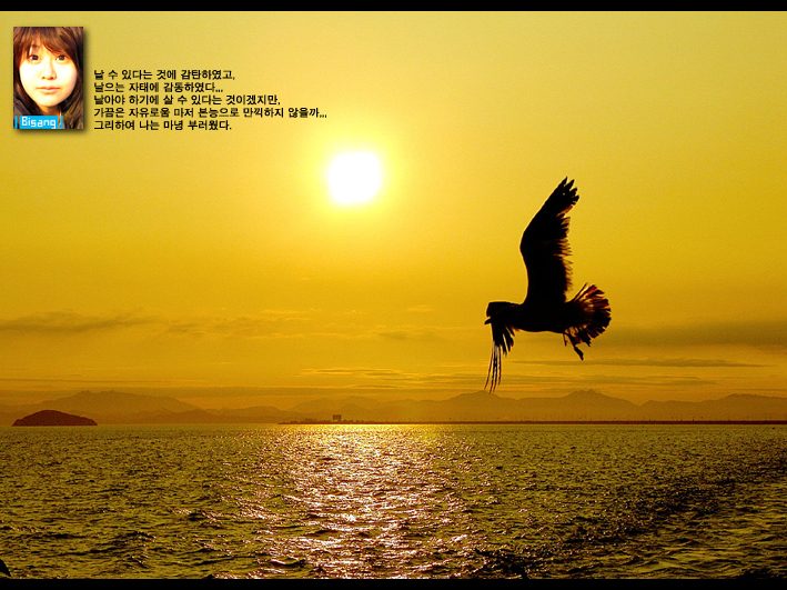비상이 이쁜 사진으루 박아주지...먹이를 들고 날아가는 지친새가 며칠 굶어 핏기 없는 비상이 얼굴을 대변하는 듯 보이잖아여,,,,;;;