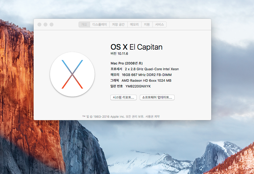 모델 식별자: MacPro3,1 (MacPro3,1은 Mac OS 10.5.1부터 Mac OS 10.11 엘캐피탄까지 설치가능합니다.)
