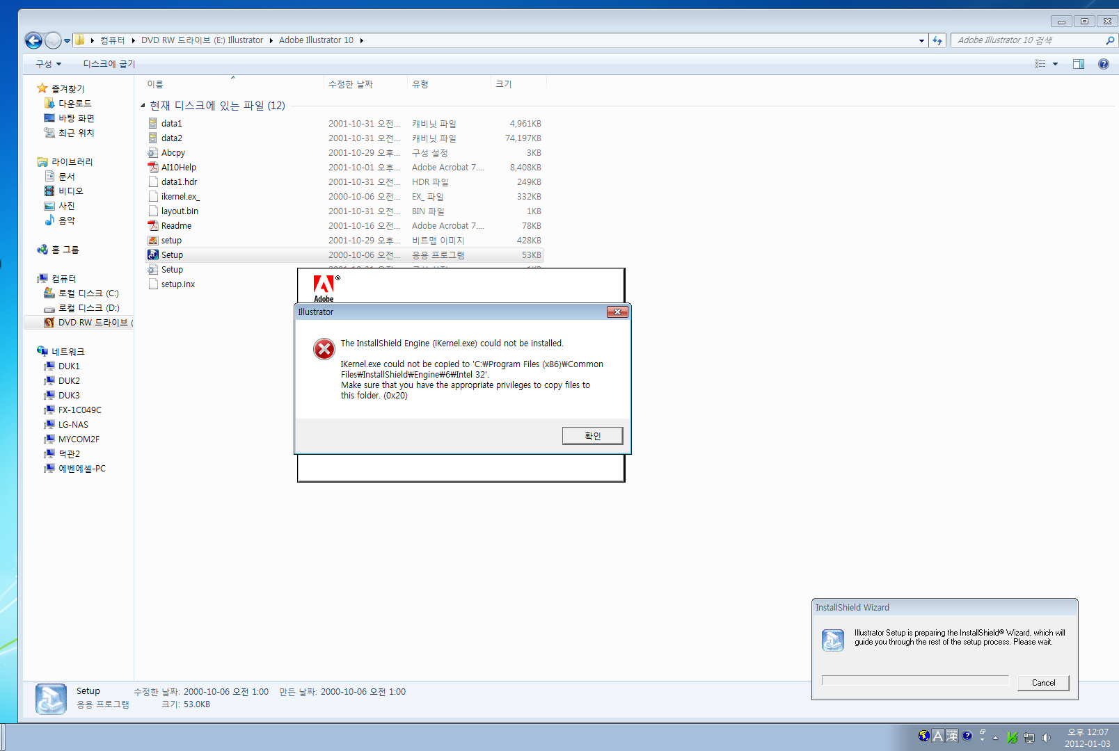 ㅋㅋ 자세히 보니깐 V3켜져있네요 바이러스 프로그램 다 끄고 설치해보세요^^ 성공하시길...