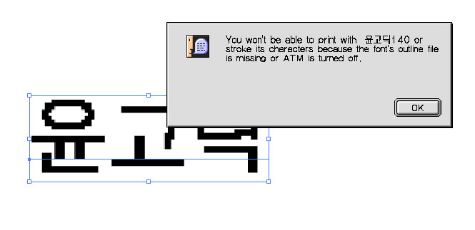 윤서체가 화면용 서체이기 때문에 아웃라인이 안되다는 경우 메세지 입니다.(메세지에 ATM이라는 단어가 있어서 헤깔린수 있습니다.)