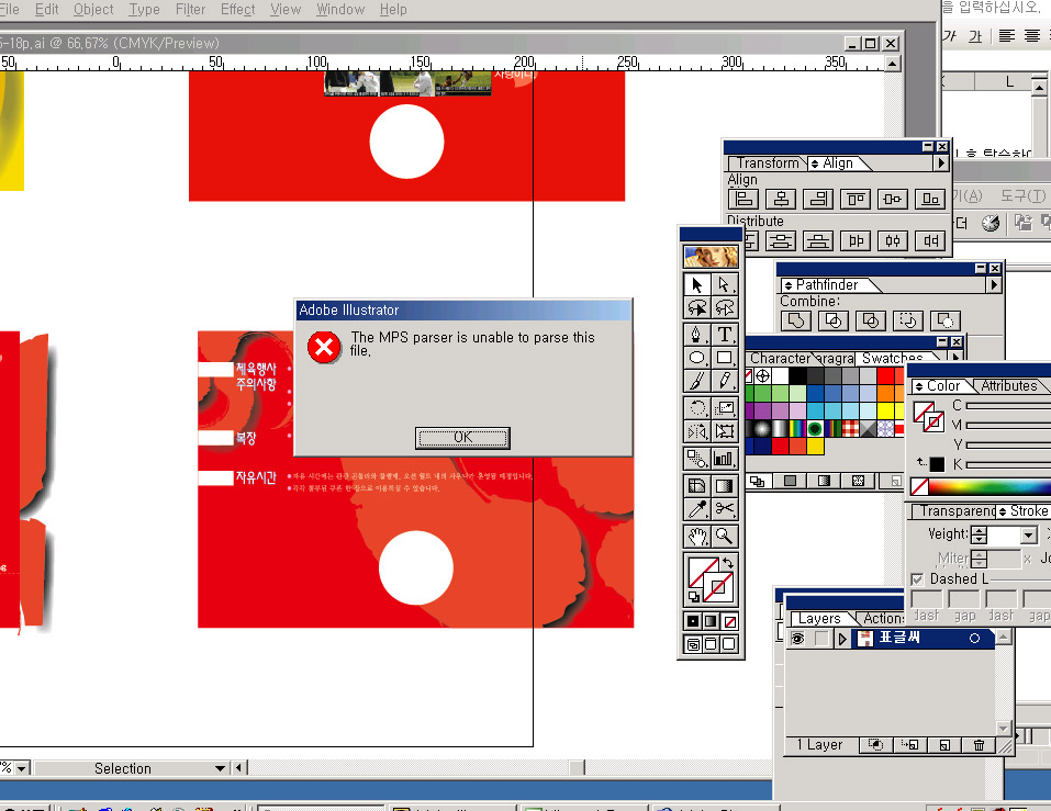볼드체나 이탤릭체로 지정된 부분이 있으면 안되는 경우가 있기 때문에 보통체로 한번 해보시구요.(낮은 일러(8.0)버전에서 열어보세요.)