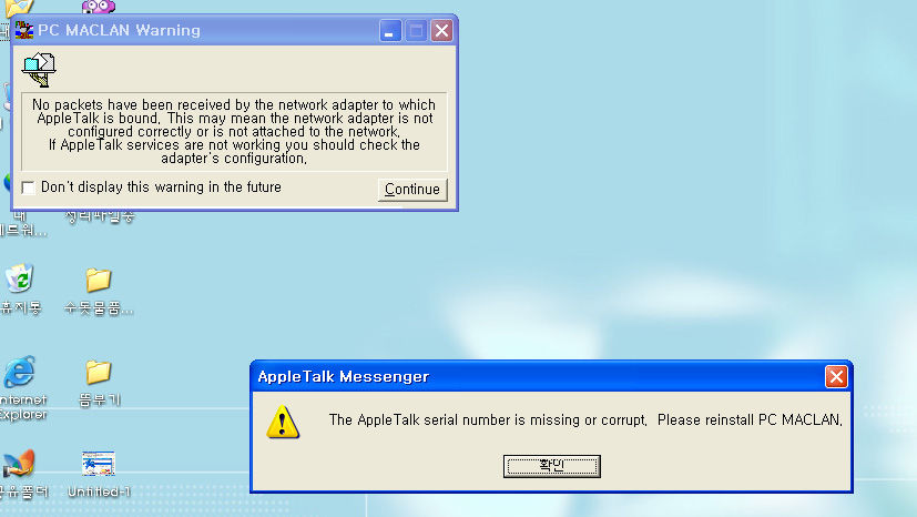 안녕하세요? 박노훈입니다. PC MacLAN의 파일 설정이 엉켜 재설치를 요구하는 상황으로 보입니다. 메시지로 보아서는 애플톡의 시리얼 넘버가 엉켰거나, 누락되었다는 내용이며, 이는 PC MacLAN의 재설치를 통해서만이 해결될 수 있는 증상으로 여겨지네요. 감사합니다.