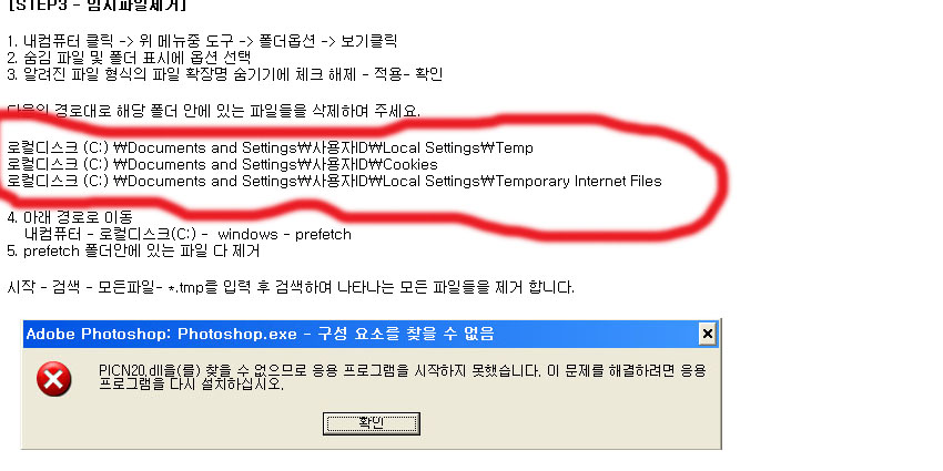 그후 포토샵을 실행시킬때 마다 에러메세지가 뜨네요..