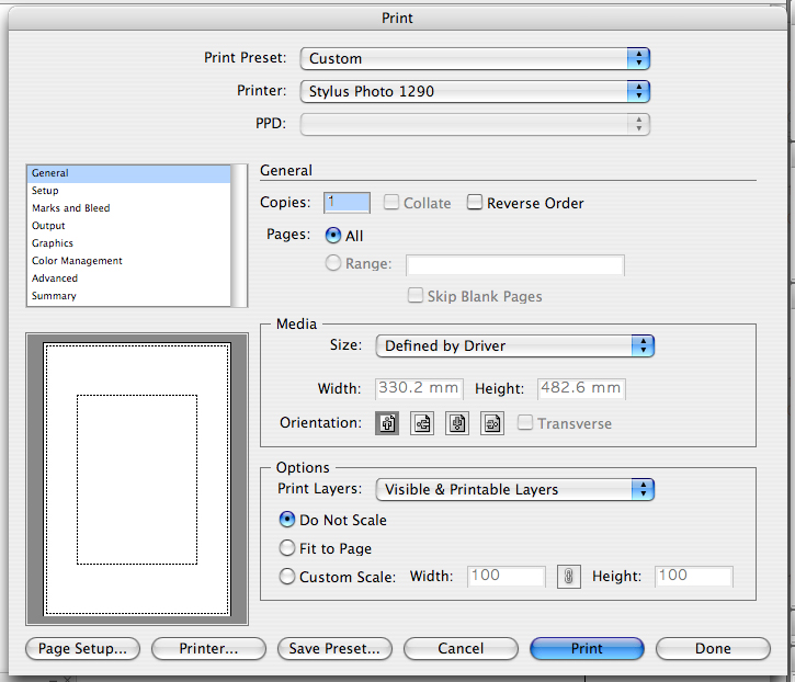 일단 Print Preset을 초기값(아마도 Default로 되어 있을 것입니다.)으로 선택을 한 후에 출력을 해보시고, 그래도 여전히 흐리게 출력이 되면 제가 잡아 놓은 설정을 알려드리오니 참조를 해보시기 바랍니다.