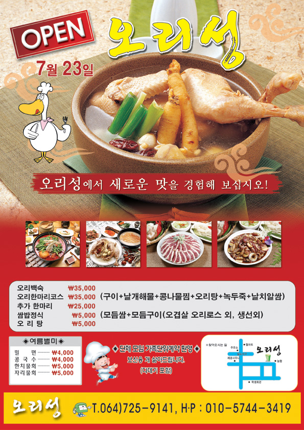 여름이라 그런지 입맛 다시게 되네요^^ 밑에 오리백숙(메뉴), 여름별미, 오리성 전화번호등 박스로 되어있는 부분 옆선과 간격이 들쑥날쑥 한데. 맞추면 더 깔끔해 보이지 않을까 싶네요.