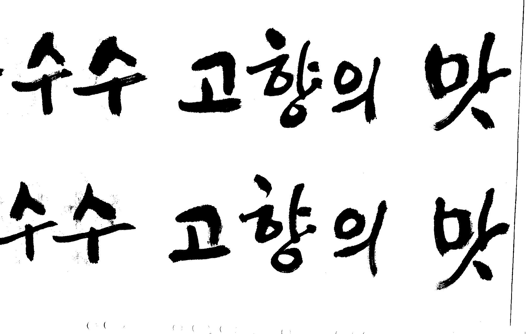 캘리고수님.. 캘리 부탁드립니다. 김철호 일반 1 12574 2008.10.31 15:45 > > > > > 강원도 > > 찰옥수수 > > 고향의 맛 > > > > 이상의 문구 입니다. > > 캘리 고수님들 시간되시면 도움 부탁드립니다.. > > > > 유용하게 쓰시길 , 스캔이 깨끗하지 못해서 수고 좀 하셔야 겠네요.. > "맛"이 라는 글자가 잘 않나와서 따로 올립니다. >