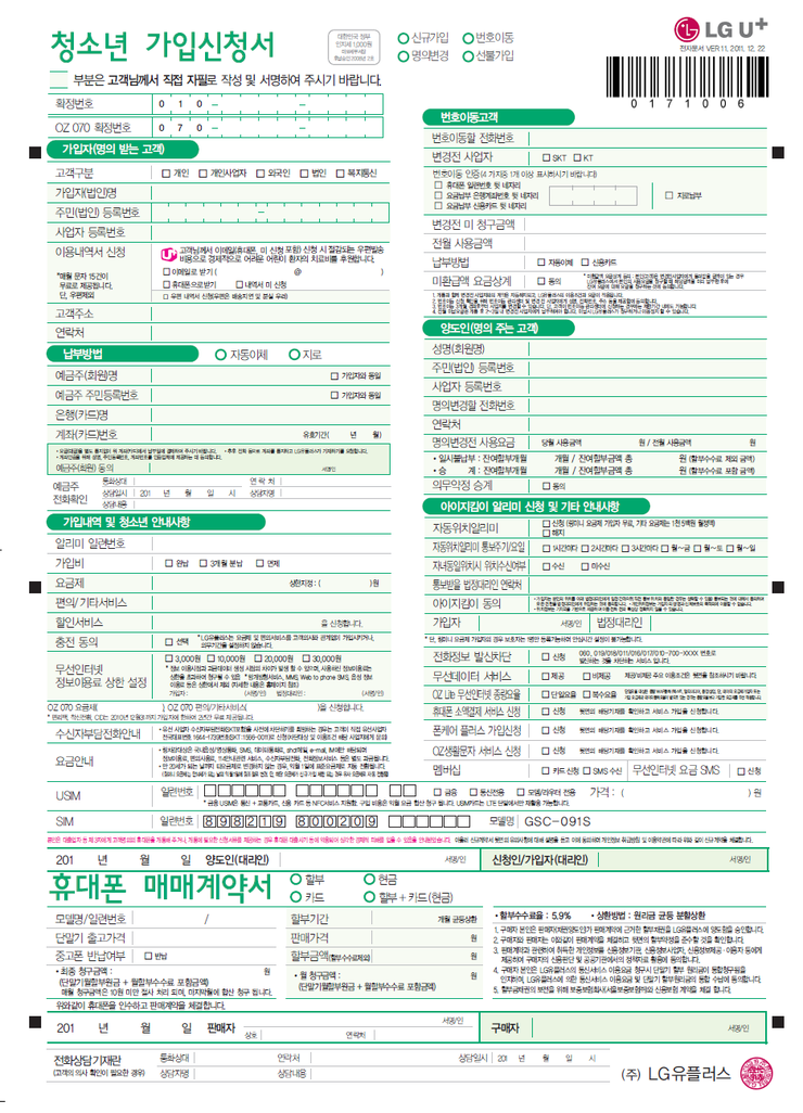 모바일 가입신청서(예시 아래 이미지 참고)